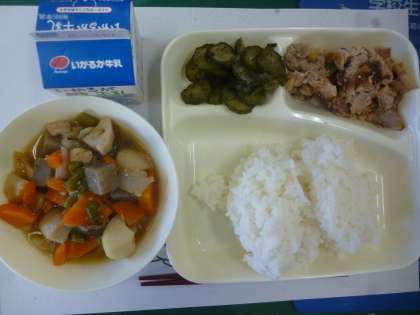 10月21日の給食は「豚肉のねぎじょうゆ焼き」「ふきよせ煮」「きゅうりのあかじそあえ」です。ふきよせ煮はたくさんの野菜があり、だしとよく合っていました。