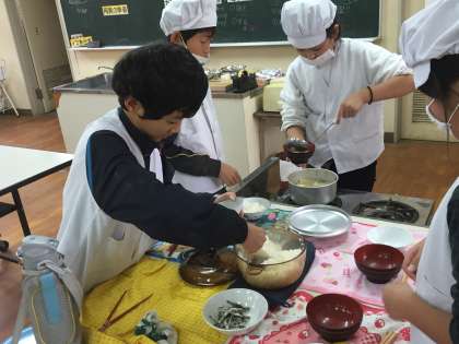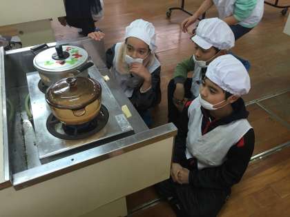 ガラスのお鍋なので、ごはんが炊ける様子がよくわかります。沸騰してあわが吹きこぼれると大騒ぎでした。とってもおいしいご飯とみそ汁ができあがり、みんな大満足でした。