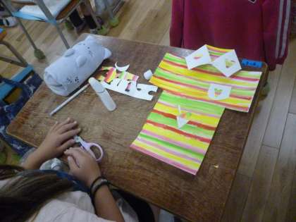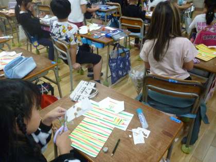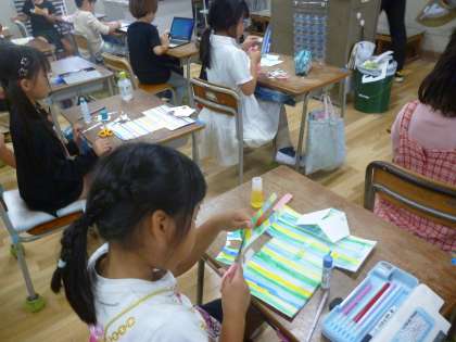 以前に紹介しましたが、2年生は初めての水彩絵の具の学習で画用紙に絵の具で何本も横線を描きました。今日はその画用紙を折って、シャツの形にしました。写真のようにとてもきれいなシャツができました。