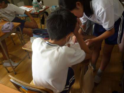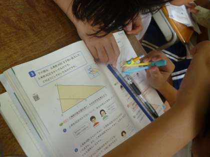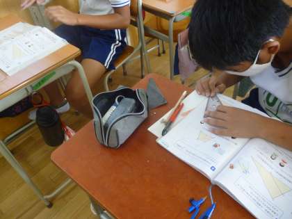 6年生は算数で図形の拡大について学習しています。今日は三角形の拡大図を書いていきました。定規やコンパスを使ってていねいに書いていました。今日も友達同士で教え合いをしていました。