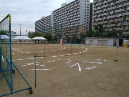 明日の運動会の準備はすっかり整いました。上の写真は赤組側(光団地側)で下は白組(道路側)です。本部テントの左右に撮影エリアがあり、そこから入退場門までが保護者席です。撮影エリアは各学年の演技、競技が始まってから開放します。
