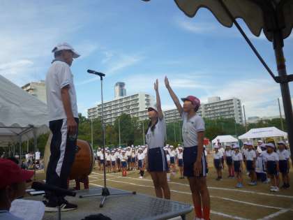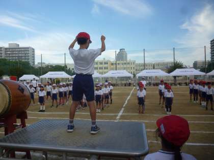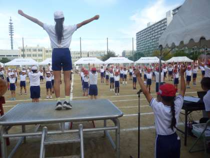 開会式は続きます。児童代表の言葉はマイクなしで大きな声で言っており、大きな拍手をいただきました。元気よく校歌を歌い、ラジオ体操で体をほぐしました。