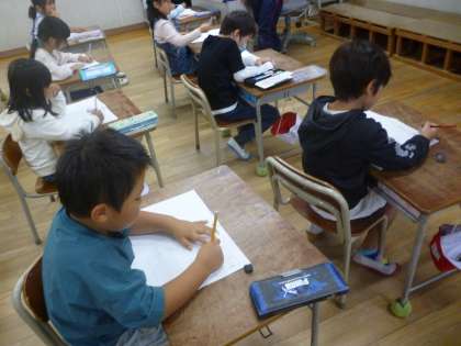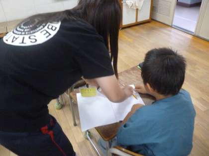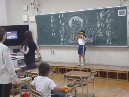 1年生は運動会のダンスの装飾を付けて記念撮影をしました。練習が始まってから毎日つけていた運動会ノートに運動会の感想を書き、みんなからのメッセージも書いてもらいました。よい記念品になります。