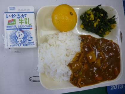 10月29日の給食は「ポークカレーライス」「ほうれん草のソテー」でデザートにみかんが出ました。人気のカレーライスに子どもたちは大喜びで、11時過ぎから校舎内にいい匂いが漂ってきました。