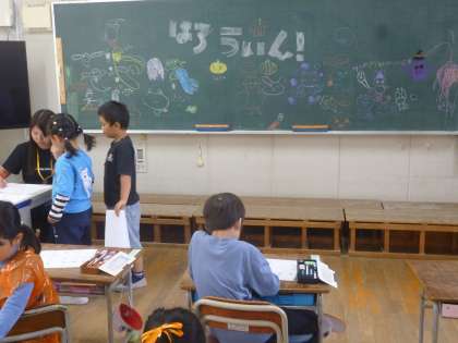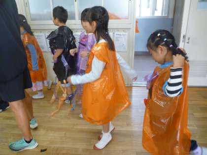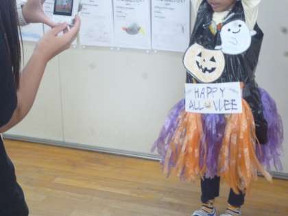 昨日、10月31日、ビニール袋で服を作り、ハロウィン仕様に装飾して着ていきました。一人一人、記念撮影をし、ハロウィン気分を盛り上げていました。黒板に子どもたちもハロウィンらしい絵や文字を書いていました。もちろん、授業の妨げになるので次の時間には消しています。