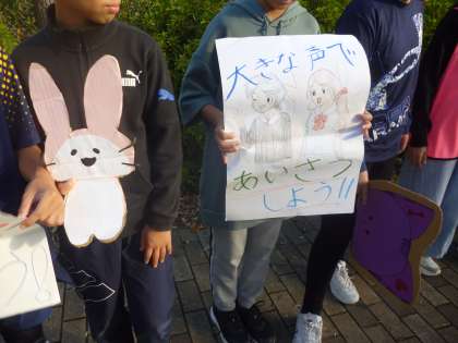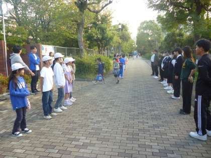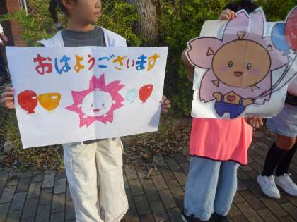 今日は小中連携の一環として児童会があいさつ運動をしました。本校と南港桜小学校の児童会、南港北中学校の生徒会が本校の正門前で登校する子どもたちにあいさつをしていきました。あいさつをアピールするポスターも作ってあいさつを促していました。明日は南港桜小学校で行います。