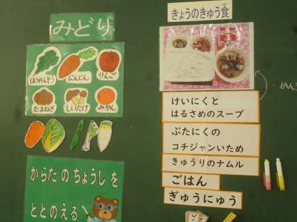 11月5日の給食は「豚肉のコチジャン炒め」「鶏肉とはるさめのスープ」「きゅうりのナムル」です。おわかりと思いますが韓国・朝鮮の料理献立です。栄養授業では今日の献立の栄養についての説明がありました。