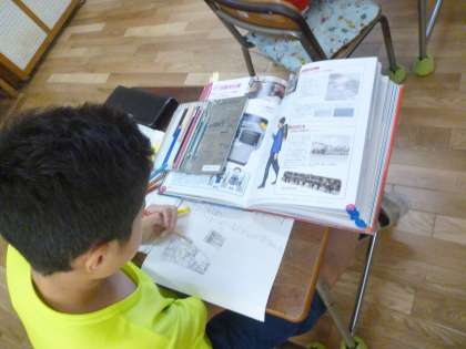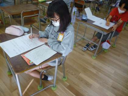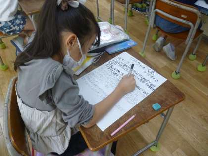 3年生は国語で文房具について調べています。画用紙に文章と絵でまとめています。だんだんと完成に近づいてきています。