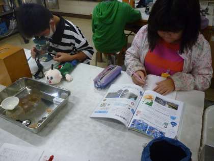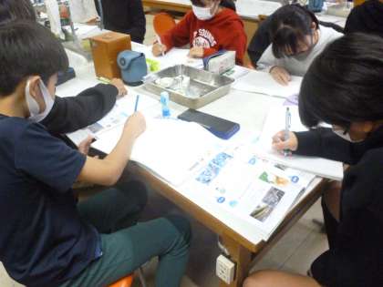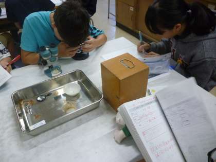 6年生は理科で火山灰と砂を観察し、その違いを考えました。顕微鏡やルーペで拡大していき、その違いをノートに文章と絵でまとめていきました。