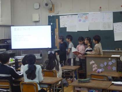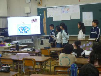 5年生は和の文化についてグループで調べてまとめてきました。今日はその発表です。パワーポイントを使ってプレゼンを作成し、発表し合いました。