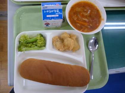 11月7日の給食は「白身魚のフリッター」「ミネストローネ」「ブロッコリーのサラダ」です。フリッターはサクッとした歯触りでおいしく調理されていました。