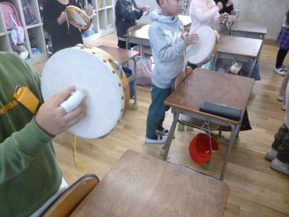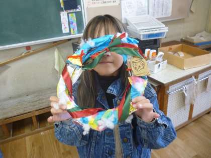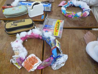 2年生はクリスマスリースが完成してきました。綿などを付けて仕上げていきました。音楽ではウッドブロック、タンバリン、鈴、トライアングル、カスタネットの打楽器を順番に演奏していきました。