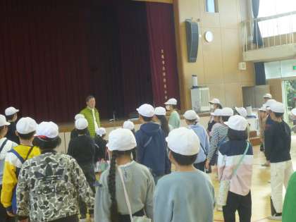 10月9日は土曜授業で「光ハイク」を行いました。地域、PTAの方々がゲームのブースを用意され、それを子どもたちがたて割りのグループで巡る活動です。各ブースと子どもたちの様子を紹介していきます。まず、開会式を行い、地域の代表の方からお言葉をいただきました。それからスタートです。