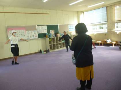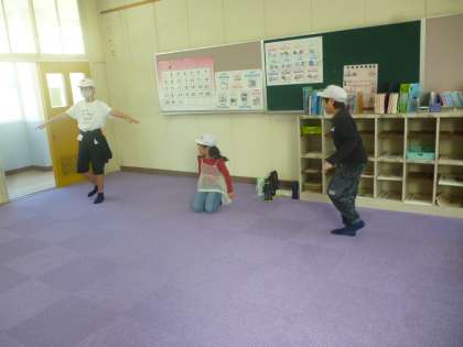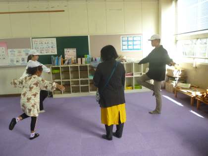 次は「かかし」です。目をつぶってかかしの格好をします。長い時間、倒れないことが得点につながります。結構長く、がんばっていました。