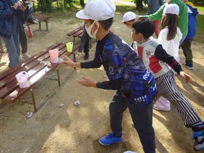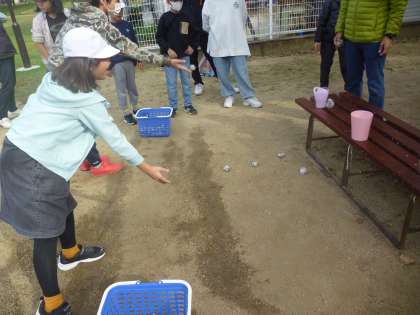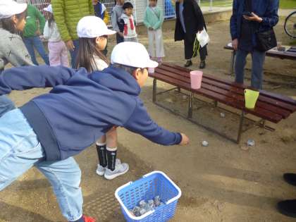 外のブースに移ります。「ミニ玉入れ」です。写真の容器に新聞紙の「玉」を時間内にいくつ入れるかです。見た感じよろなかなかうまく入らないものです。このブースは社会福祉協議会と「はぐくみネット」部会の方々が担当されました。