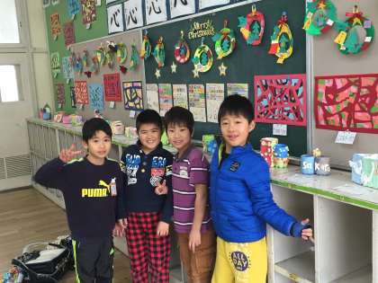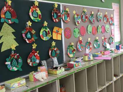 どの教室にもクリスマスの飾りがあります。3年生はリースをつくっています。