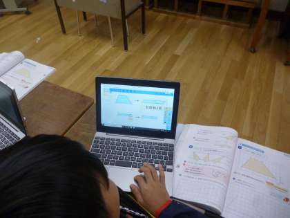 5年生は平行四辺形に続いて、台形の面積の求め方を考えました。平行四辺形の時と同じように、端末で図形を操作しながら求めていきました。