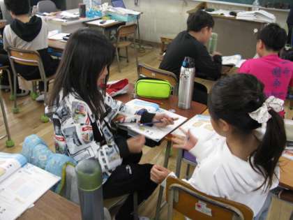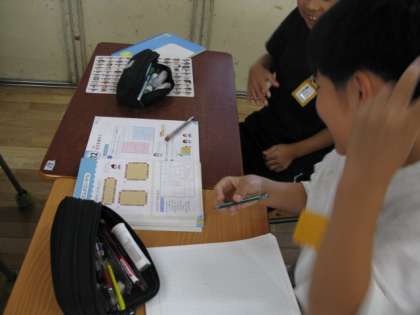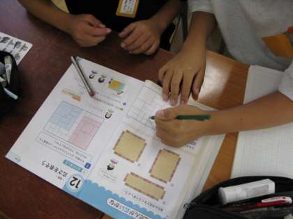 4年生は算数で「陣地りゲーム」をしました。二人でジャンケンをしていき、勝ったほうが升に色を塗っていきゲームです。楽しみながら面積について理解していきました。