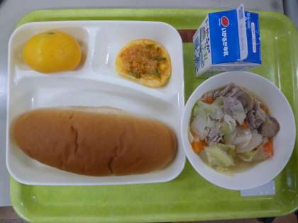 11月14日の給食は、「黒糖パン」、「豚肉と野菜のスープ煮」、「変わりピザ」、「みかん」です。「変わりピザ」に使われているギョウザの皮のパリパリの食感がおもしろかったです。スープ煮は野菜がよく煮込まれていて、おいしかったです。