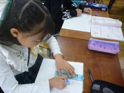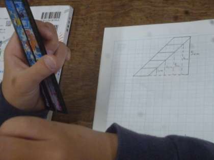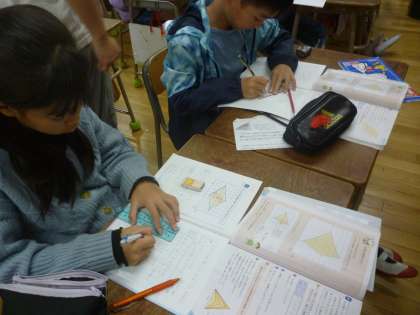 5年生は図形の面積を求めてきました。今日はその応用で「底辺が同じで、高さを変えていくと面積はどう変わるか」について考えました。写真のように平行四辺形を積み上げた図をノートに書き、面積の変化の法則について考えていきました。同じように三角形も考えていきました。