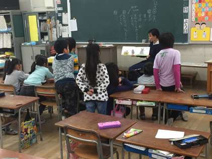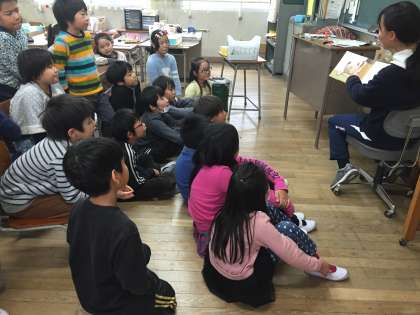 3年生の教室です。先生が本の読み聞かせをしています。低学年の子どもたちばかりでなく、本を読んでもらうのは大好きです。