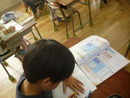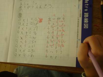 2年生は九九の学習がついに「9の段」まできました。ノートに「9×1」から順番に書いていき、赤鉛筆で読み方も書いていき、唱えていました。