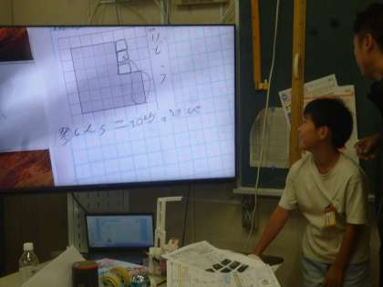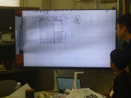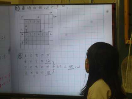 4年生は切り取りのある四角形の面積を求めました。写真のようにいく通りも求め方があります。自分で考えた方法を説明していきました。