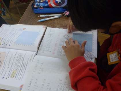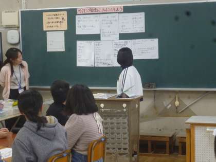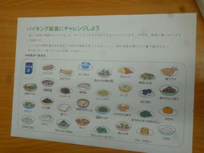 6年生は栄養授業で「バイキング給食」を考えました。食材がたくさん載ったカラー写真を見て栄養のバランスの良い給食を考えました。