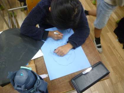 「リコーダーを吹く自分」の版画は下絵を描いていきました。