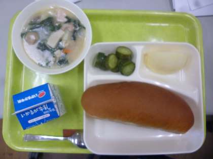 11月21日の給食は「鶏肉ときのこのシチュー」「きゅうりのピクルス」でデザートにりんごがでました。鶏肉ときのこはとても相性がよく調理されていました。