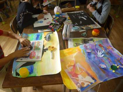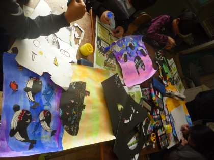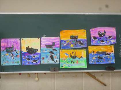3年生は「海の楽隊」の絵を描いています。海の上に船があり、海の中に楽隊がいるイメージです。魚などのパーツを作って貼っていました。