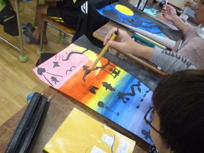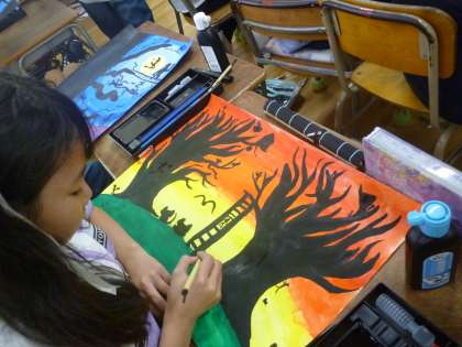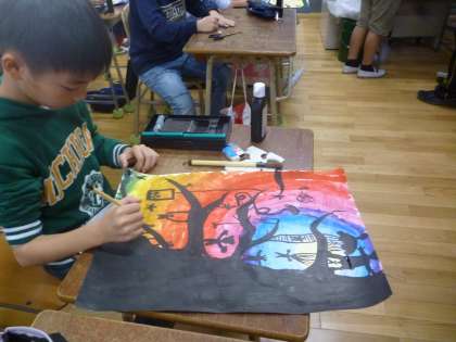 5年生は大樹で遊ぶイメージで絵を描いています。木を黒く塗り、影の感じがよく出ています。