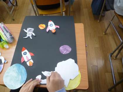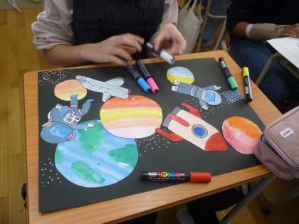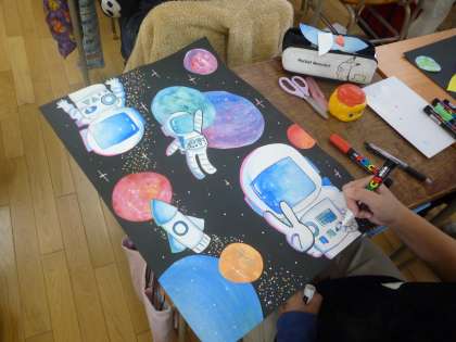 6年生は宇宙遊泳の絵を描いています。宇宙飛行士を仕上げていましたが、いい感じが出ています。