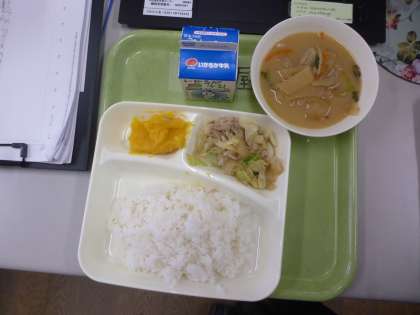 11月22日の給食は「豚肉と野菜のいためもの」「いわしのつみれ汁」「かぼちゃういろう」です。つみれ汁はしょうがの風味が効いていてとても美味しくいただきました。