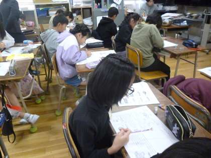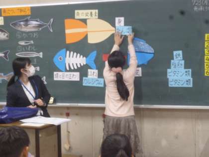5年生は栄養について近隣の学校の栄養教諭の先生に教えてもらいました。テーマは「魚」の良さを知ろう」です。魚の種類、栄養などくわしく教えてもらいました。黒板に貼られた魚に 部首ごとに栄養素のカードを貼っていきました。