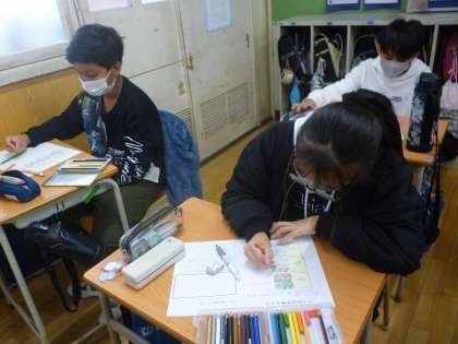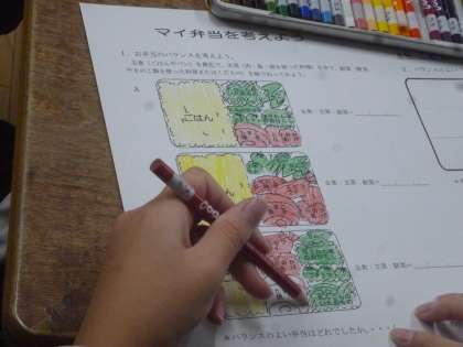 6年生も栄養授業をしました。テーマは「マイ弁当を作ろう」です。栄養の偏りがないように3大栄養素を考慮して、食材を選んでオリジナルのお弁当のイラストと献立を完成させていました。