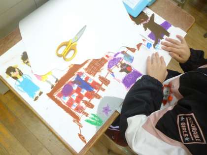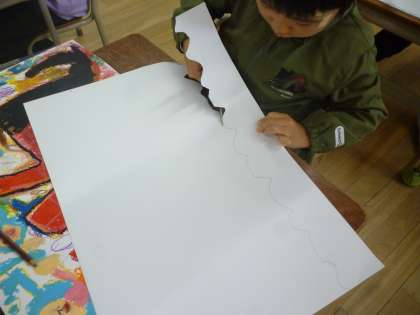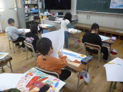 1年生は「海遊館の絵」に「波」を付けました。写真のように画用紙を波型に切って貼っていきました。出来上がりが楽しみです。