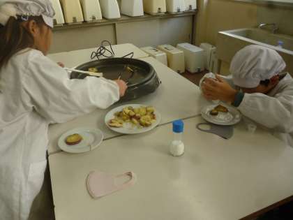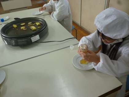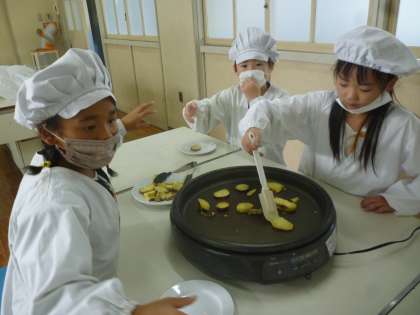 2年生はおいもパーティーをしました。いもは学習園で採れたさつまいもです。担任が前日に切って下ごしらえをした芋をホットプレートで焼いていきました。焼きあがった芋は、そのまま、塩、はちみつと好みに合わせてつけて食べました。「おいしい!」という声があちらこちらから聞こえ、素敵な笑顔でした。