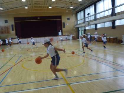 3年生は体育でバスケットボールの練習をしていきました。ドリブル、ドリブルなしのシュート、ドリブルからのシュートなど、練習を続けていきました。シュートが決まった時は、両手を挙げて喜んでいました。、