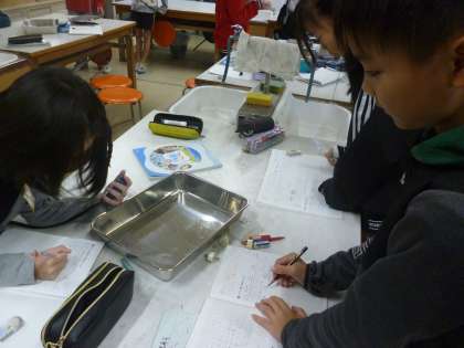 5年生は理科で振り子の実験を続けてきました。これまで「振れ幅を変える」「重さを変える」実験をしてきました。今日は最後の実験で「長さを変える」です。ストップウォッチで測り、平均値を班で計算していきました。「長さを変えた時だけ往復の時間が変わる」ということがわかりました。