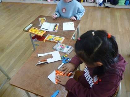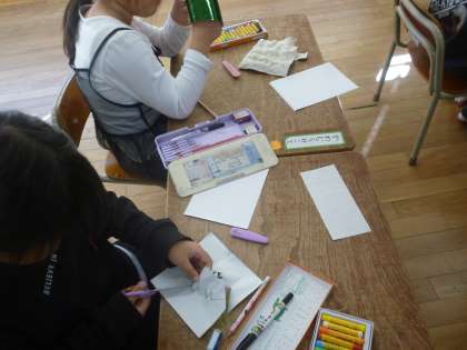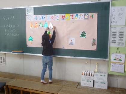 1年生はクリスマスの飾りを作っています。クリスマスツリーなどを色紙や金紙、銀紙で作っていきました。まだまだ続きをしていき、クリスマスムードを高めていきます。