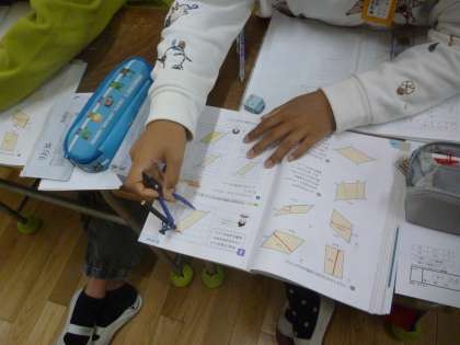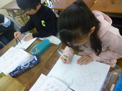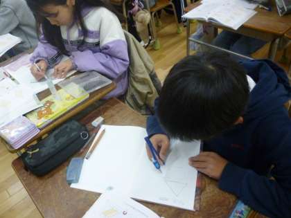 5年生は算数で平行四辺形を書きました。教科書の見本の平行四辺形をそのままノートに書きます。コンパスで辺の長さを測ったり、分度器で角度を測ったりして工夫しながら書いていきました。慎重に長さや角度を測っていました。