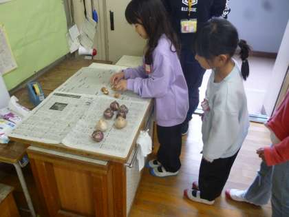 生活科で、朝顔を育てました。今度は、ヒヤシンスとクロッカスです。球根から育てます。きれいな花が咲いてくれるのが楽しみです。