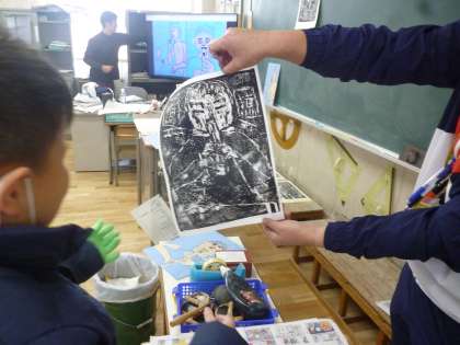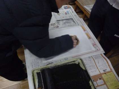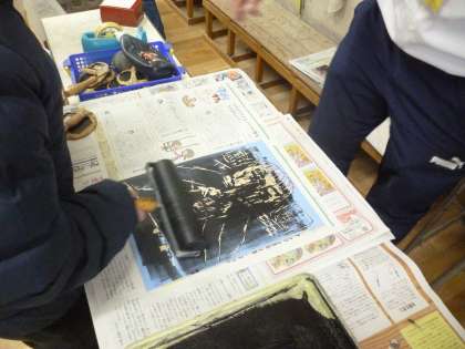 4年生は、図画工作で取り組んでいる版画「リコーダーを持つ自分」の板を彫る活動が終了した子が出てきています。今日は、印刷をしている場面に立ち会えました。しっかりと印刷されるように、気持ちを込めてばれんでインクと紙をなじませていました。