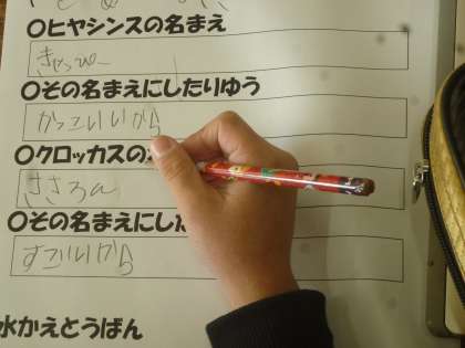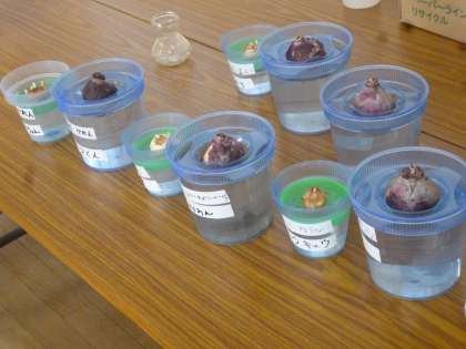 1年生は水栽培でクロッカスとヒアシンスを育てています。愛情をもって育てるため、自分の球根に名前を付けました。大事に育てていき、来春にはきれいな花が咲くでしょう。