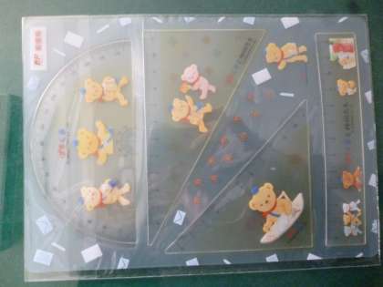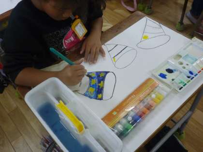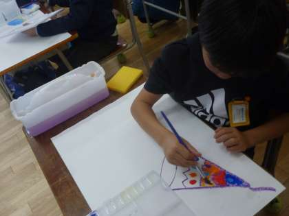 郵便局から見学のお土産に分度器と三角定規のセットをいただきました。ありがとうございました。絵の具の使い方に慣れるためクラッカーを描いて色を塗っていきました。