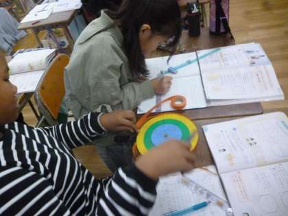 5年生は算数で円について学習しています。身の回りの円形の物の円周と直径をテープで測り、その関係性について考えました。