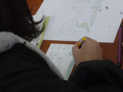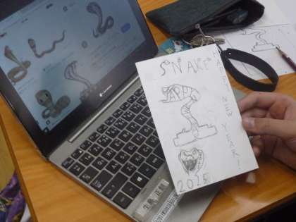 6年生は年賀状を書きました。インターネットで「へび」のイラストを調べ、絵も描いていきました。