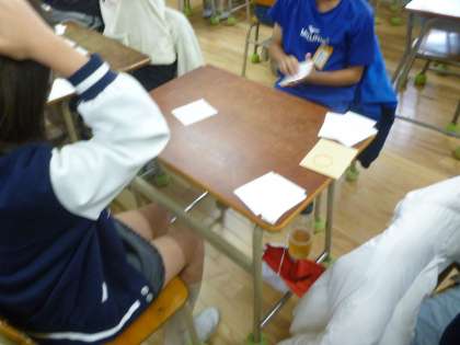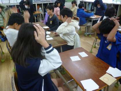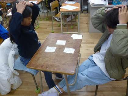 4年生は百人一首大会をしました。二人で向き合い、先生が読み札を読み上げ、札を取り合っていました。