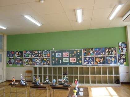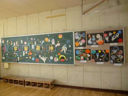 6年生の「宇宙遊泳」(絵画)、「未来の私」(工作)です。